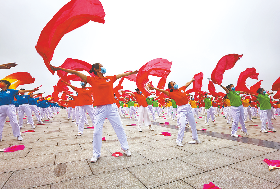 “山鼓舞,水欢腾,带着丰收的好心情,乘着那东西南北风,金秋相约在天中……”当天上午,驻马店国际会展中心广场红绸飞扬、金龙狂舞,嘹亮的歌声响彻天空,600余名文化志愿者舞姿翩翩、活力四射、喜气洋洋。《金秋相约在天中》《驻马店人的歌》《幸福中国一起走》,一首首乐曲唱出了驻马店人的热情,一支支舞蹈舞出了天中人的喜悦。文化志愿者们在迎风飘扬的国旗下,舞动蛟龙、抖着空竹、跳起广场舞,欢迎八方来客。