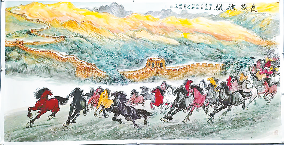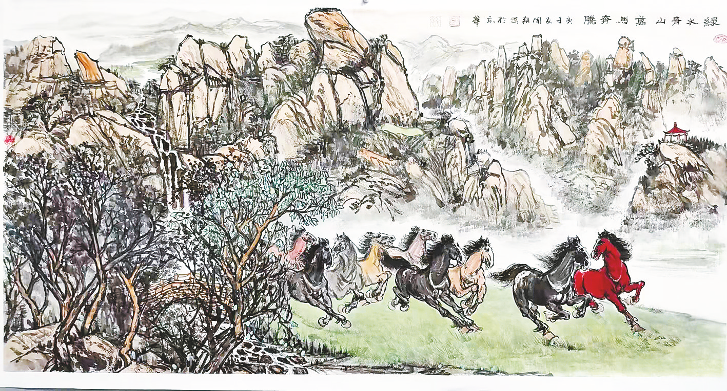 闻朝善画马,他的作品以形写神,形神俱佳。因从小生长在嵖岈山下牧马,所以他喜欢马的精神,也喜欢画马。现在的他每天耕砚临池、醉心丹青,叠叠素笺化作一幅幅飞驰的骏马。