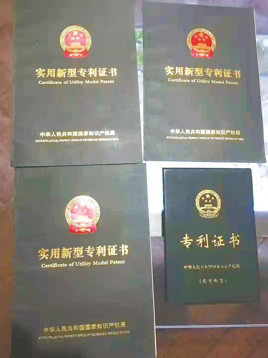 钱保忠家里摆放着各种钢管、链条、电线,俨然是个小型加工车间。记者见到钱保忠时,他正在整理自己获得的一项项专利(如图)。