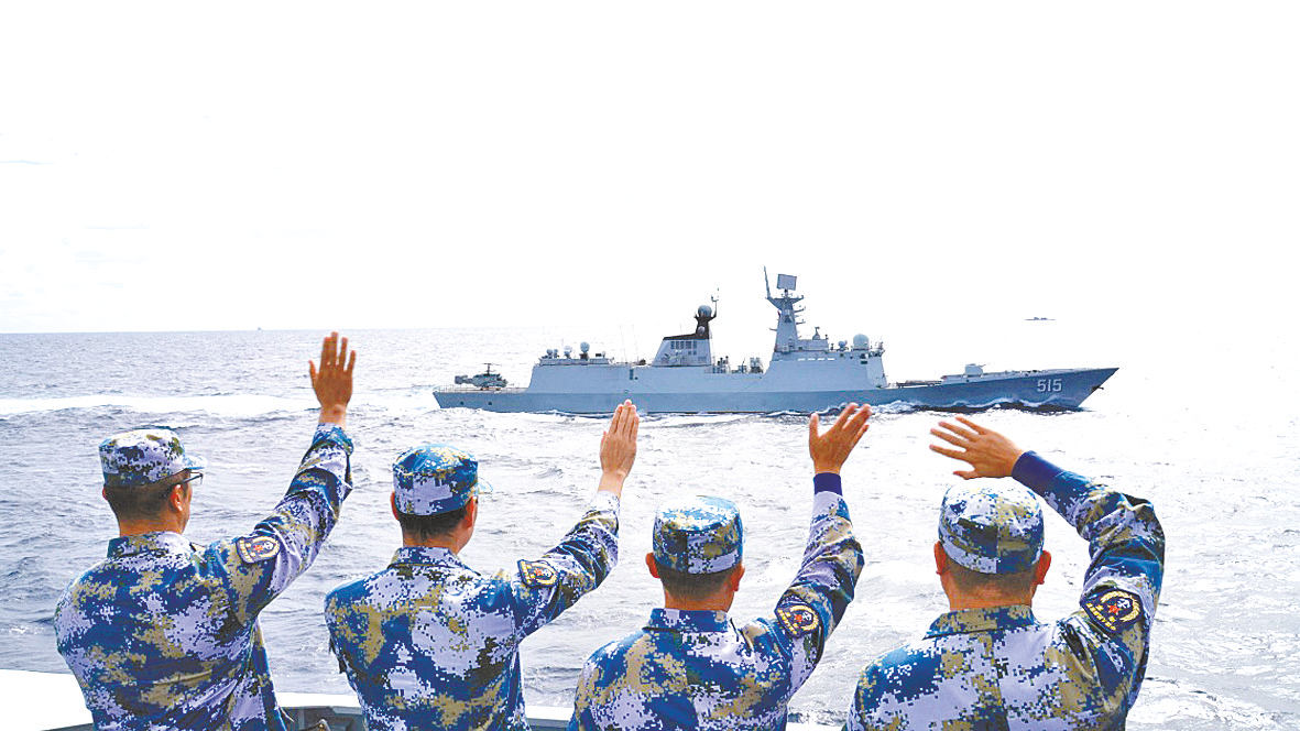 当地时间10月23日,中俄首次海上联合巡航分航仪式结束后,中方参加舰艇分别返回各自军港。这是南昌舰官兵向滨州舰挥手作别。