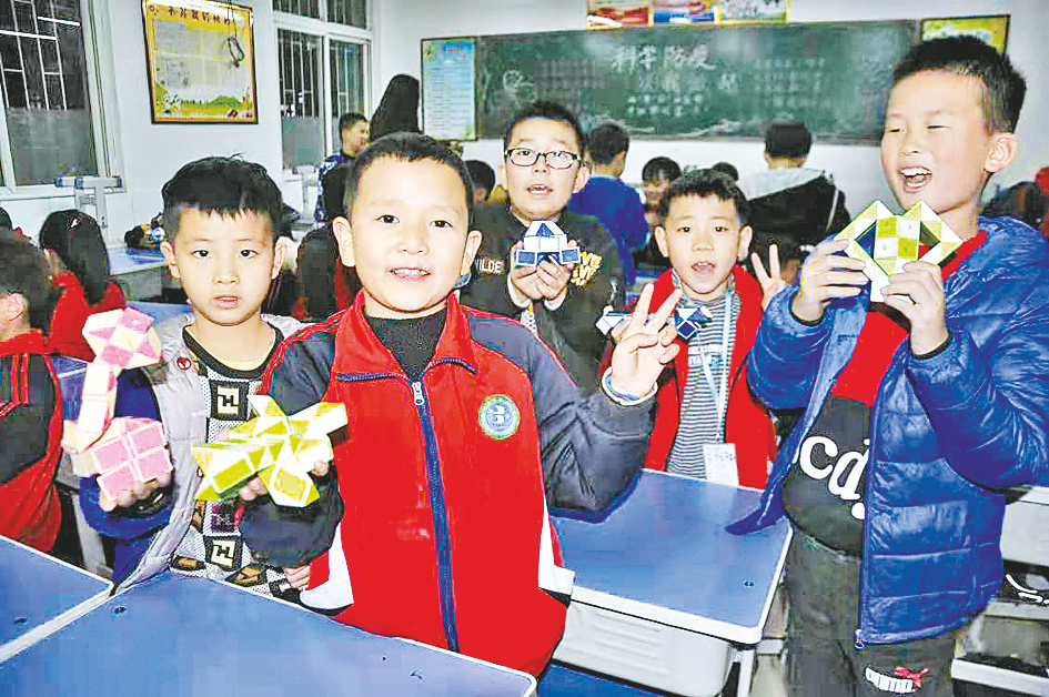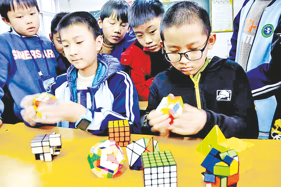 多彩魔方社团的孩子们在老师的指导下飞快地转动手中的魔方块,不一会儿工夫就把一个杂乱的魔方转变完成,无一差错。