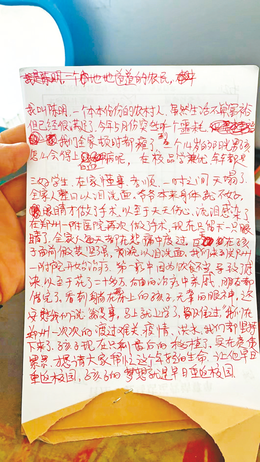 陈明家住汝南县农村,他的父亲身体不好,今年眼睛做了手术,但因为感染,在郑大一附院再次做手术后,只留下一只眼睛。本以为随着时间推移,不幸与痛苦会慢慢淡去,可谁知今年5月,又一场噩耗袭来:陈明14岁的儿子陈一豪被确诊为白血病。这让陈明的生活再次布满阴云。