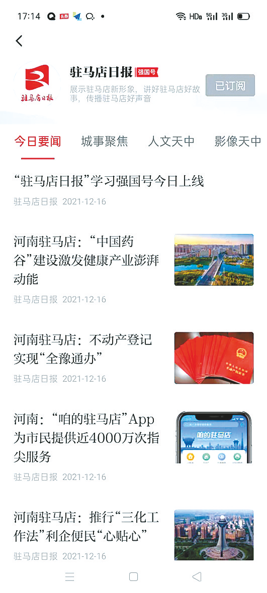 利用学习强国“读书学习”,已成为无数国人每天的必修课。2021年12月16日一大早,笔者打开“学习强国”号,看到“驻马店日报”学习强国号上线了,这是了解驻马店、宣介驻马店,观察驻马店发展脉动的新窗口。从此,无论何时无论何地,打开“学习强国号”,就能够鸟瞰天中大地日新月异的变化,俯视传奇之都突飞猛进的成长故事,一言以蔽之,你可以了解到最新、最美、最出彩的驻马店。