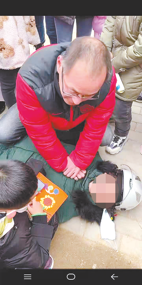 本报讯(文/图 全媒体记者 王永良)12月16日11时,驻马店市红十字蛟龙救援队队员杨允经过驻马店实验小学北区大门口时,看到一群市民围在一起,人群中有人大喊:“快打120,有人晕倒了。”
