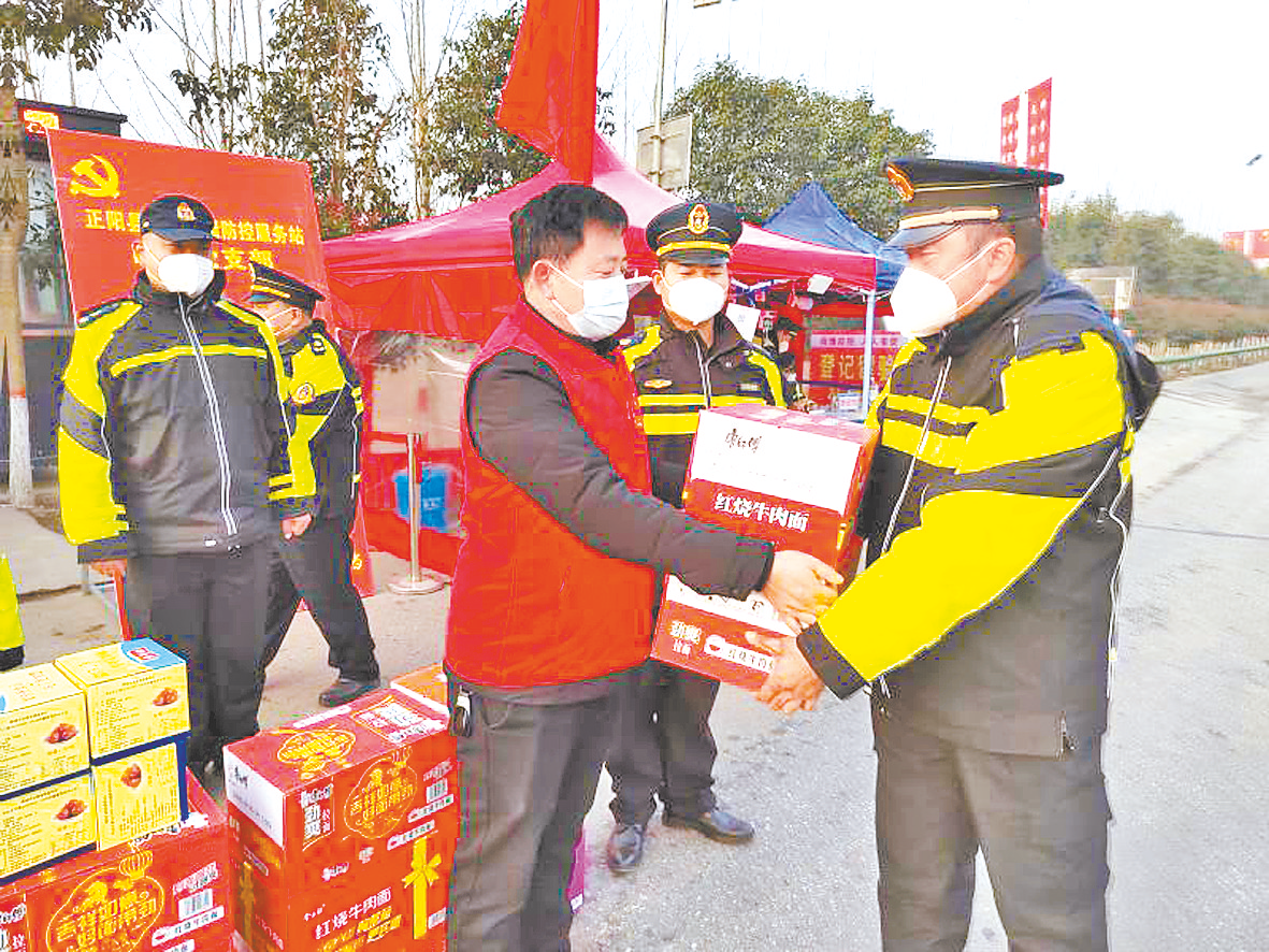 “感谢正阳县义工联合会给我们送来鸡蛋、火腿肠等物资。我们一定值好班、站好岗,守护正阳县疫情防控的西大门。”1月12日,在正阳县高速引线宋店疫情防控点值班的县交通执法局干部赖文明说。