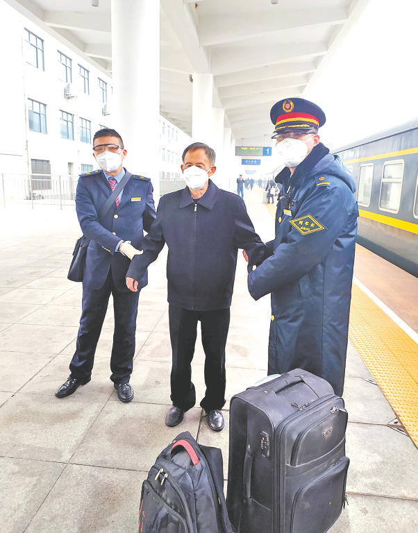1月17日是春运的第一天,列车在行驶了1399千米、运行20小时25分钟后,于当天10时47分到达驻马店站。崔彪早已整理好老人的行李。等列车缓缓停靠驻马店,他提着包裹搀扶老人下车。