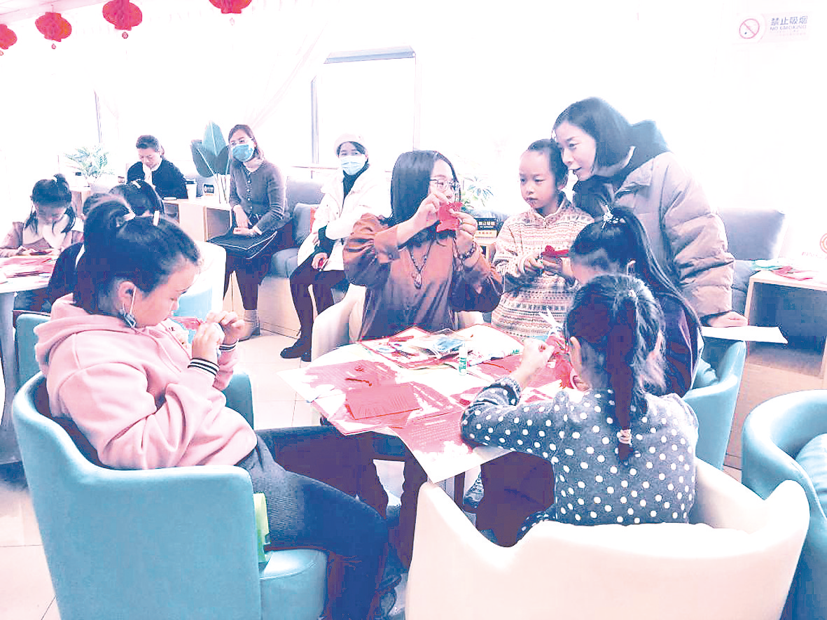 寒假期间,银川市金凤区通福社区为辖区青少年准备了多项文化活动,这是剪纸 “非遗”传承人李剑正在指导孩子们制作手工剪纸。 (艾福梅/摄)