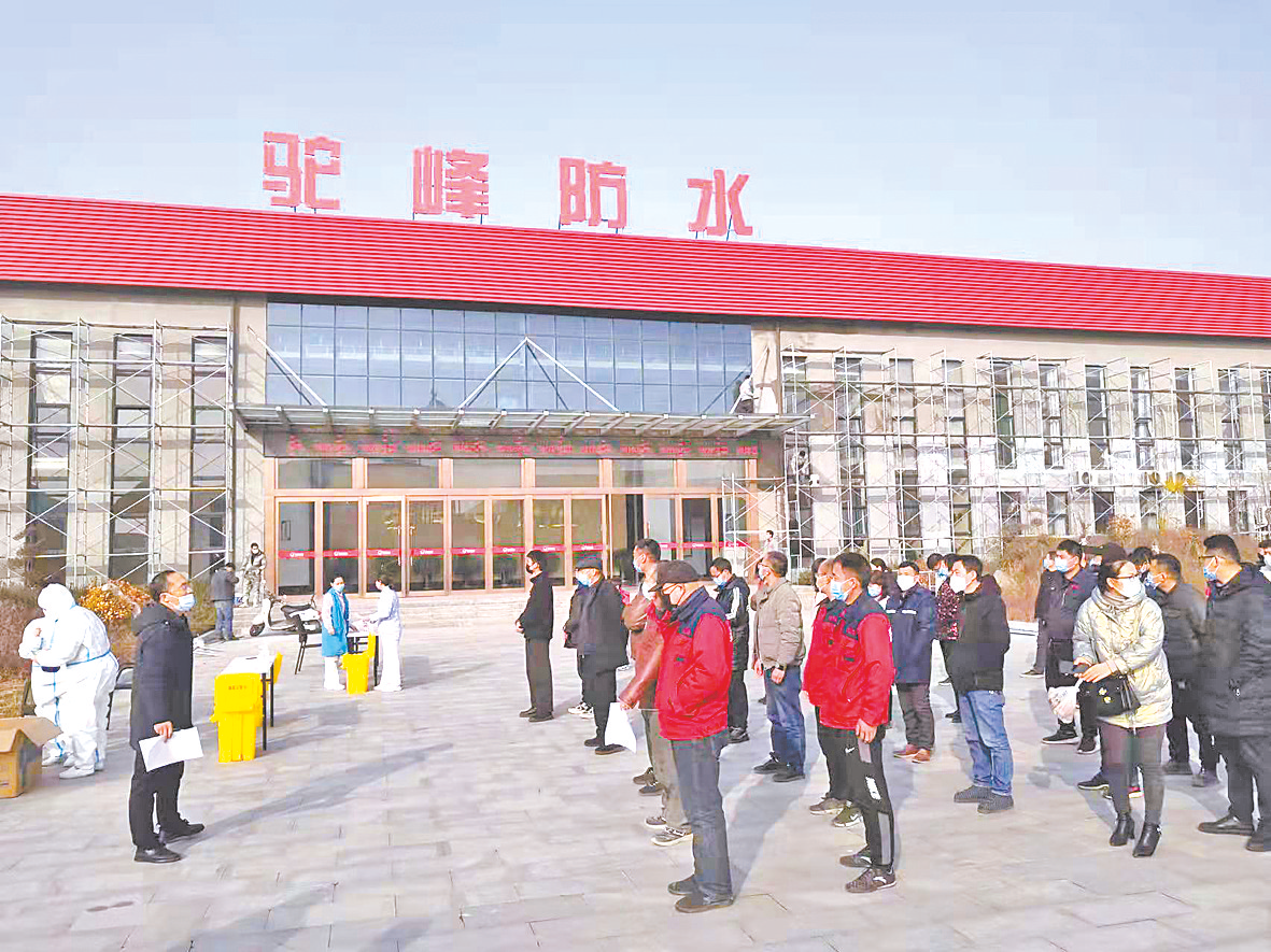 本报讯(文/图 全媒体记者张启龙 通讯员 钱红勤)近日,为认真贯彻落实平舆县委、县政府疫情防控工作部署要求,河南驼峰防水科技有限公司(以下简称驼峰防水)组织全体员工开展核酸检测(如图)。