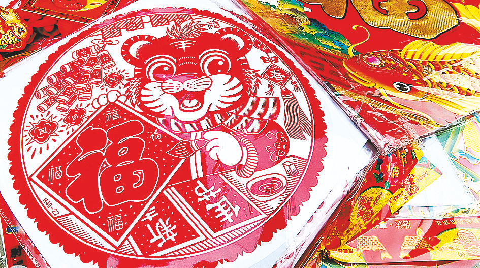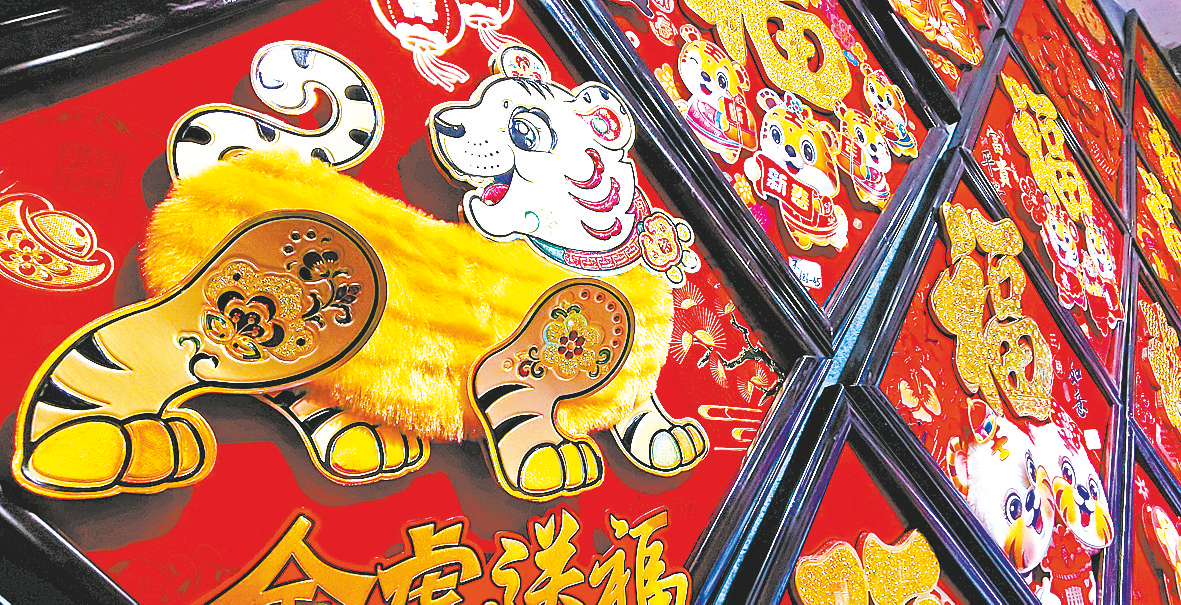 记者看到,与虎年生肖有关的春联、灯笼、剪纸、玩具等商品,夹杂着浓浓的年味,备受市民欢迎。