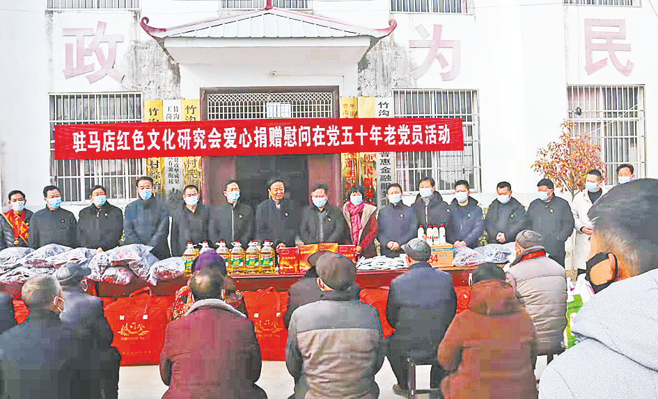 本报讯(文/图 全媒体记者 王永良)在新春佳节即将来临之际,1月18日上午,驻马店市红色文化研究会来到确山县竹沟镇王岗村开展爱心捐赠,慰问光荣在党50年老党员活动(如图)。