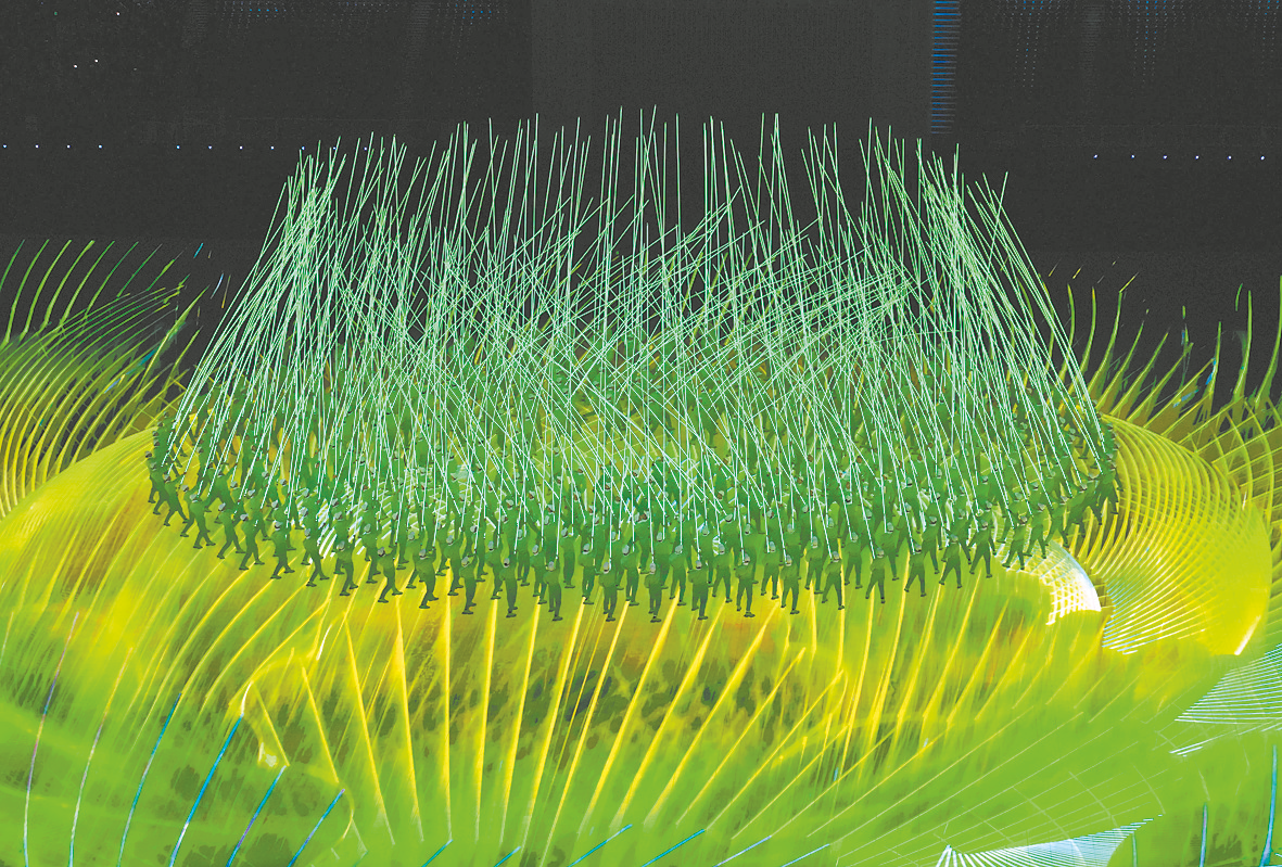 作为开幕式上紧接倒计时的首个表演环节,《立春》最让人印象深刻的,莫过于鸟巢场地中央那片拂动变换的绿色。这团如同新草萌芽、舒展的绿色,是由近400名来自山东中华武校、宋江武校的同学手