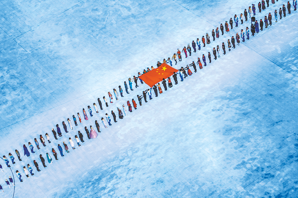 一个小男孩用小号吹响了《我和我的祖国》,悠扬的号声响彻夜空,动人的旋律直抵人心。鸟巢中央,一面五星红旗在12位小朋友手中徐徐展开。随后,他们将国旗传递给176名代表。经由一双双炽热的手,鲜艳的国旗被郑重地交给国旗班,伴随着振奋人心的国歌,五星红旗缓缓升起……这一刻令人百感交集,让人热泪盈眶。