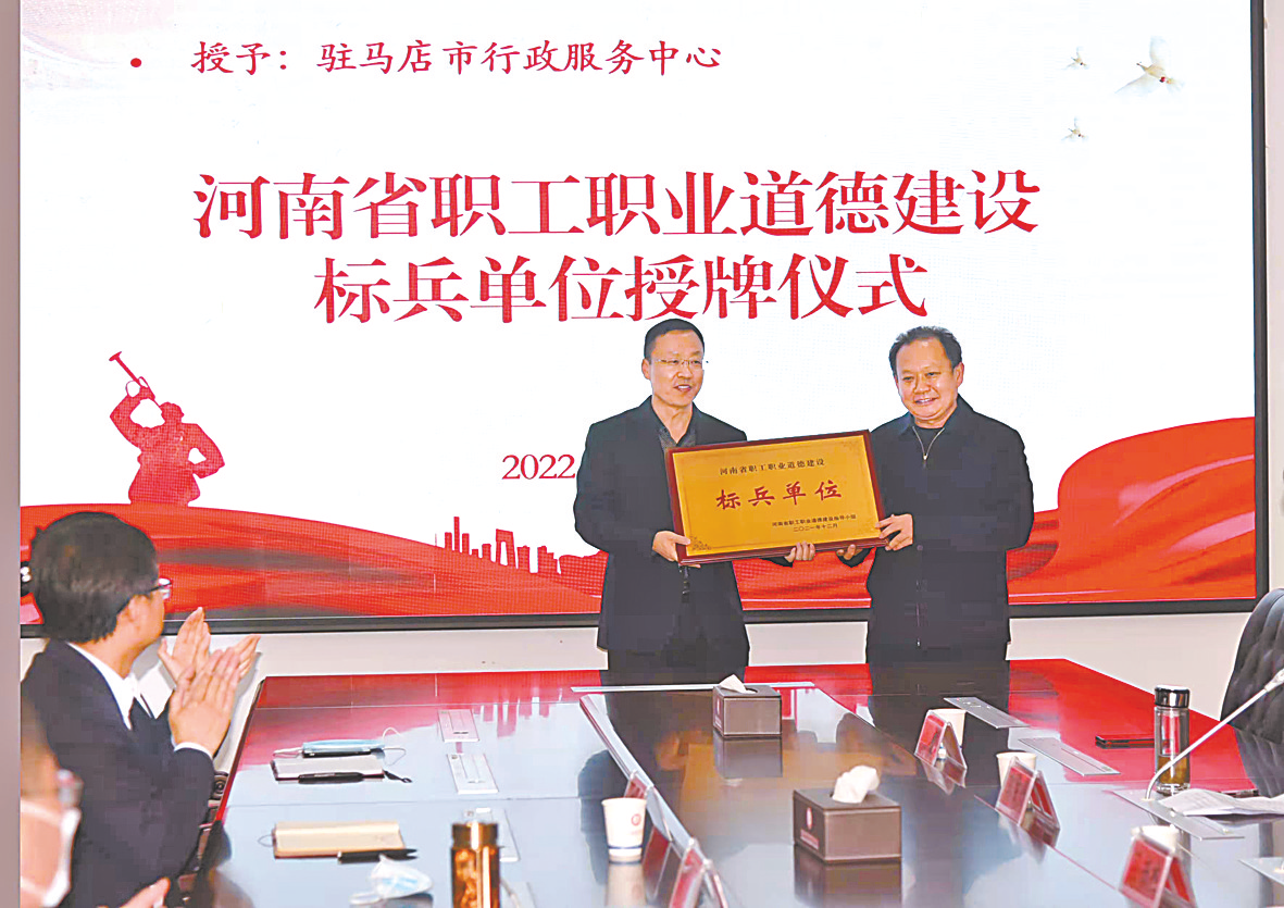3月10日,我市为获得“河南省职工职业道德建设标兵”荣誉称号单位的市行政服务中心举行授牌仪式。市二级巡视员、市委宣传部常务副部长孙书杰,市总工会党组书记、常务副主席李彬以及市行政服务中心主任姚超等参加。