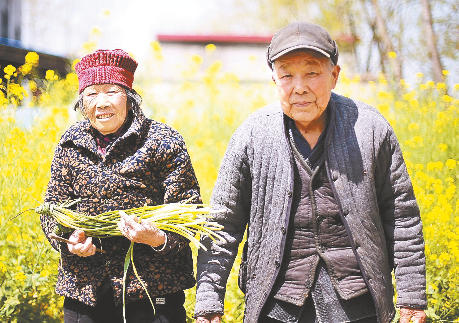 菜园子里的蒜苗长势很好,头发花白、笑起来露出满口牙的熊新芝蹲在地上,把粗壮的蒜苗剖开,抽出一根根蒜薹,每抽出一根,身体微胖、面色红润的梁立军便立即弯腰伸手接过,熟练地扎成一把,两人动作娴熟、配合默契,让人心生羡慕。