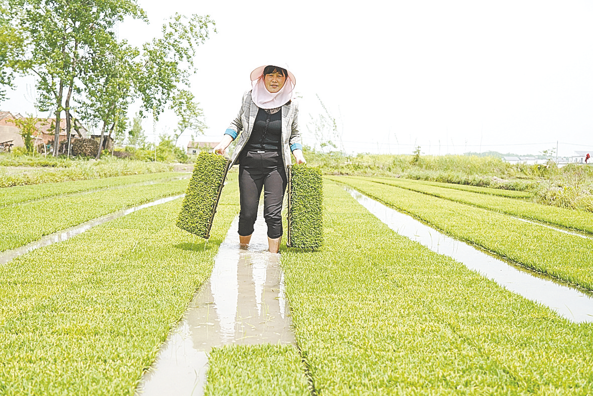“这段时间正是移苗插秧的好时节,海洲忙得很。”陈海洲的爱人蒋红赤脚在水田里一边搬运秧苗,一边告诉记者(如图)。现在早稻秧苗陆续育好,丈夫陈海洲几天前就带着秧苗去外地插秧了,她在家里看护秧苗。