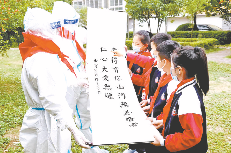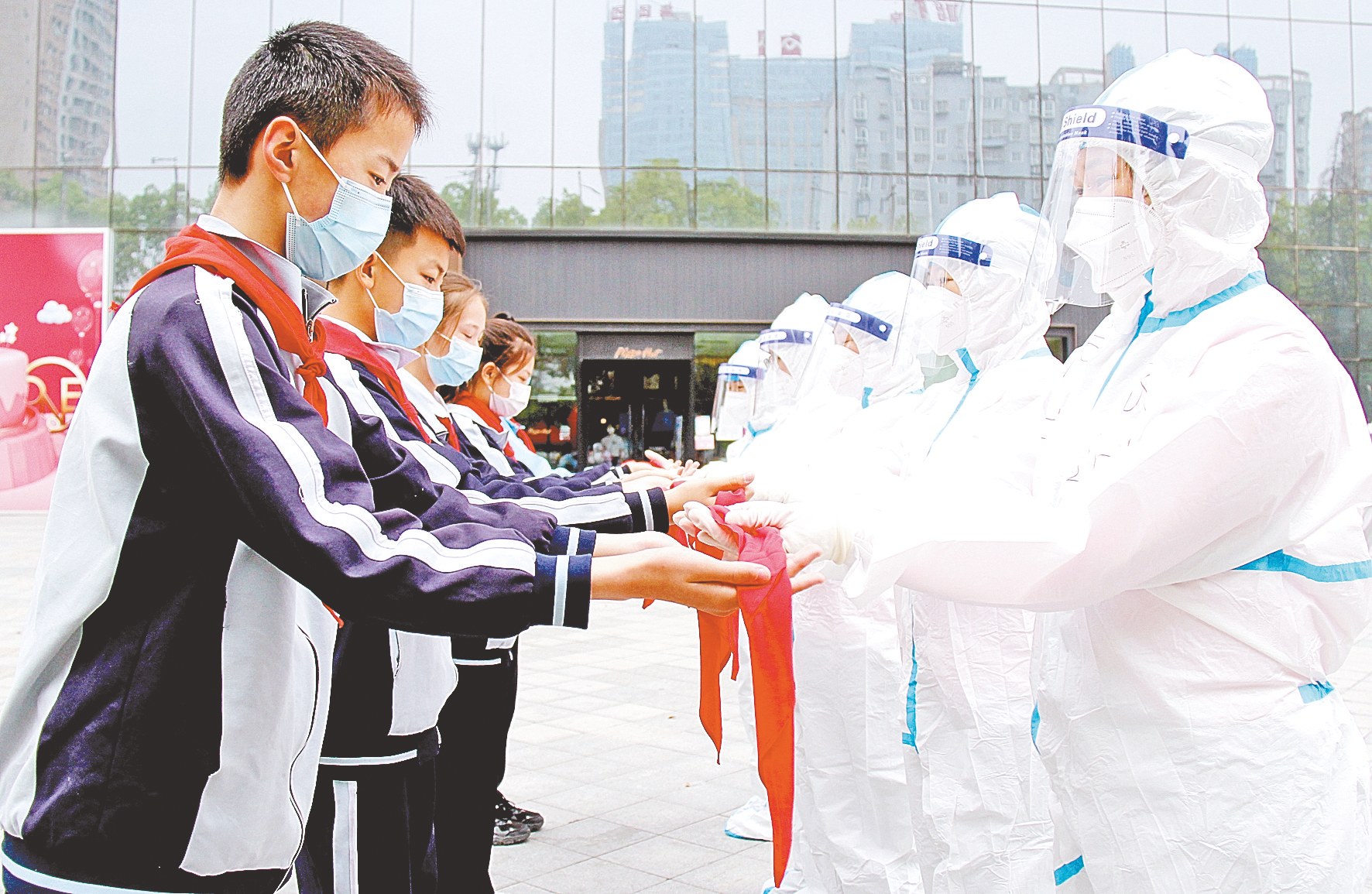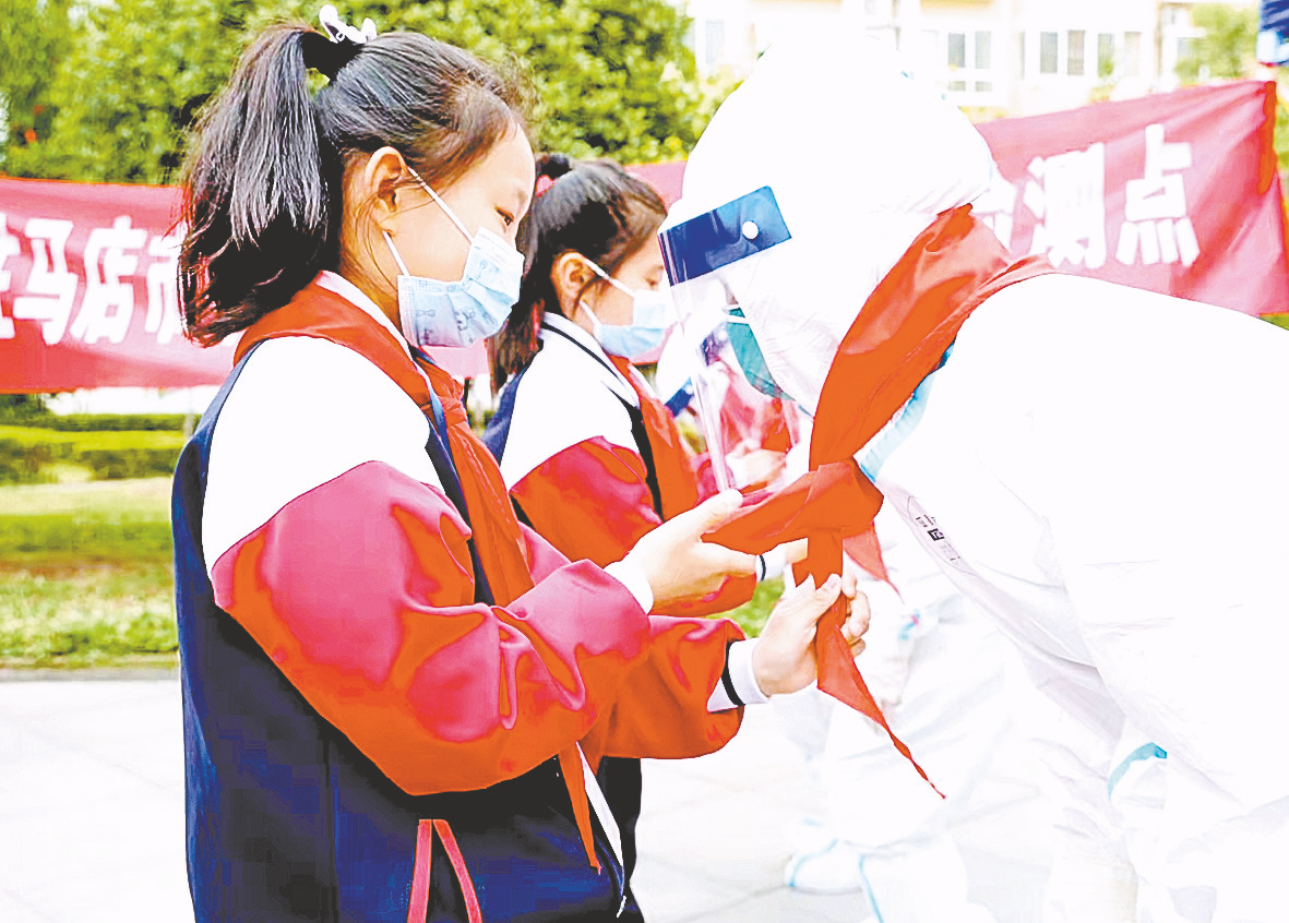 “阿姨,您辛苦了!”“这些日子多亏有你们在,我们的学习生活才能得到保障,谢谢您!”5月10日,在第111个国际护士节来临之际,驻马店市中心城区以及部分县区的各处核酸检测现场,来自全市各学校的小记者代表一起给他们心目中的偶像“大白”戴上红领巾,并将亲手制作的鲜花、书画等礼品送给自己心中的英雄。