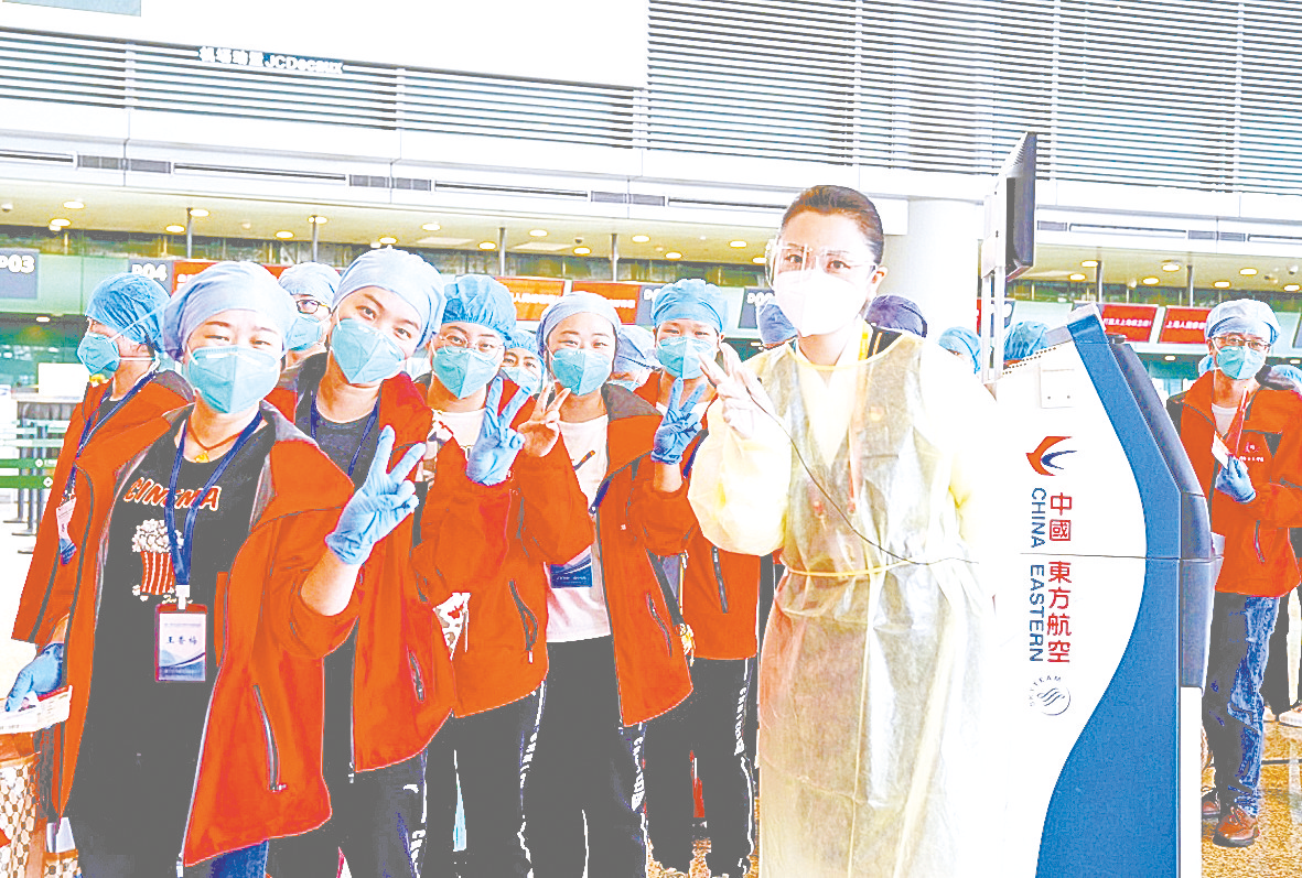 5月23日,在上海虹桥国际机场,一名机场工作人员与医疗队队员合影留念。