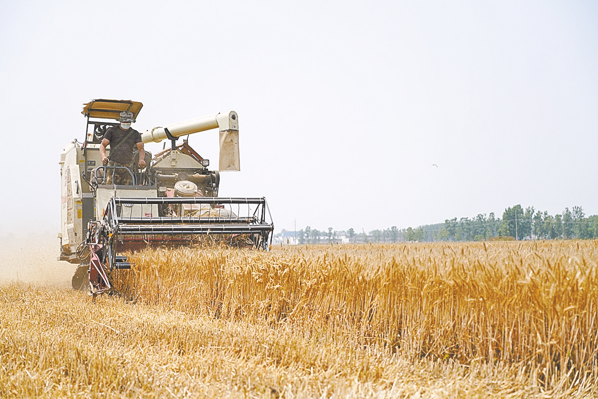 5月23日,在正阳县大林镇漫塘村,村民正在机收小麦。据悉,该县种植的180多万亩小麦已陆续成熟,广大农民朋友趁天抢时收割,确保颗粒归仓。