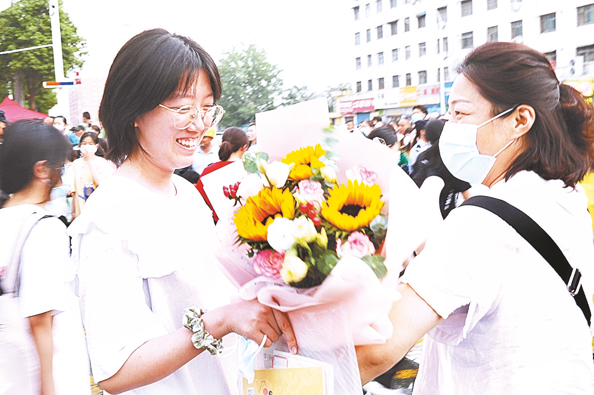 6月8日下午5时,为期两天的高考结束。在驻马店市第二高级中学考点,考生微笑着走出考场,接受亲人的鲜花和拥抱。 (全媒体记者王建成)