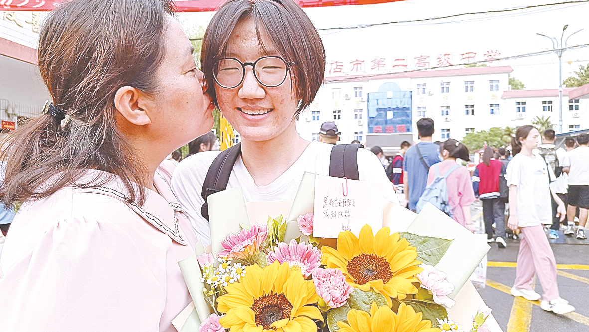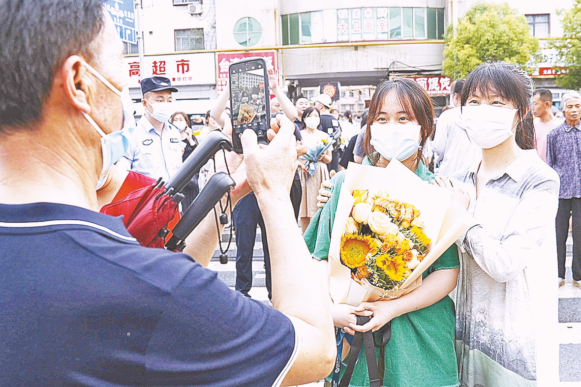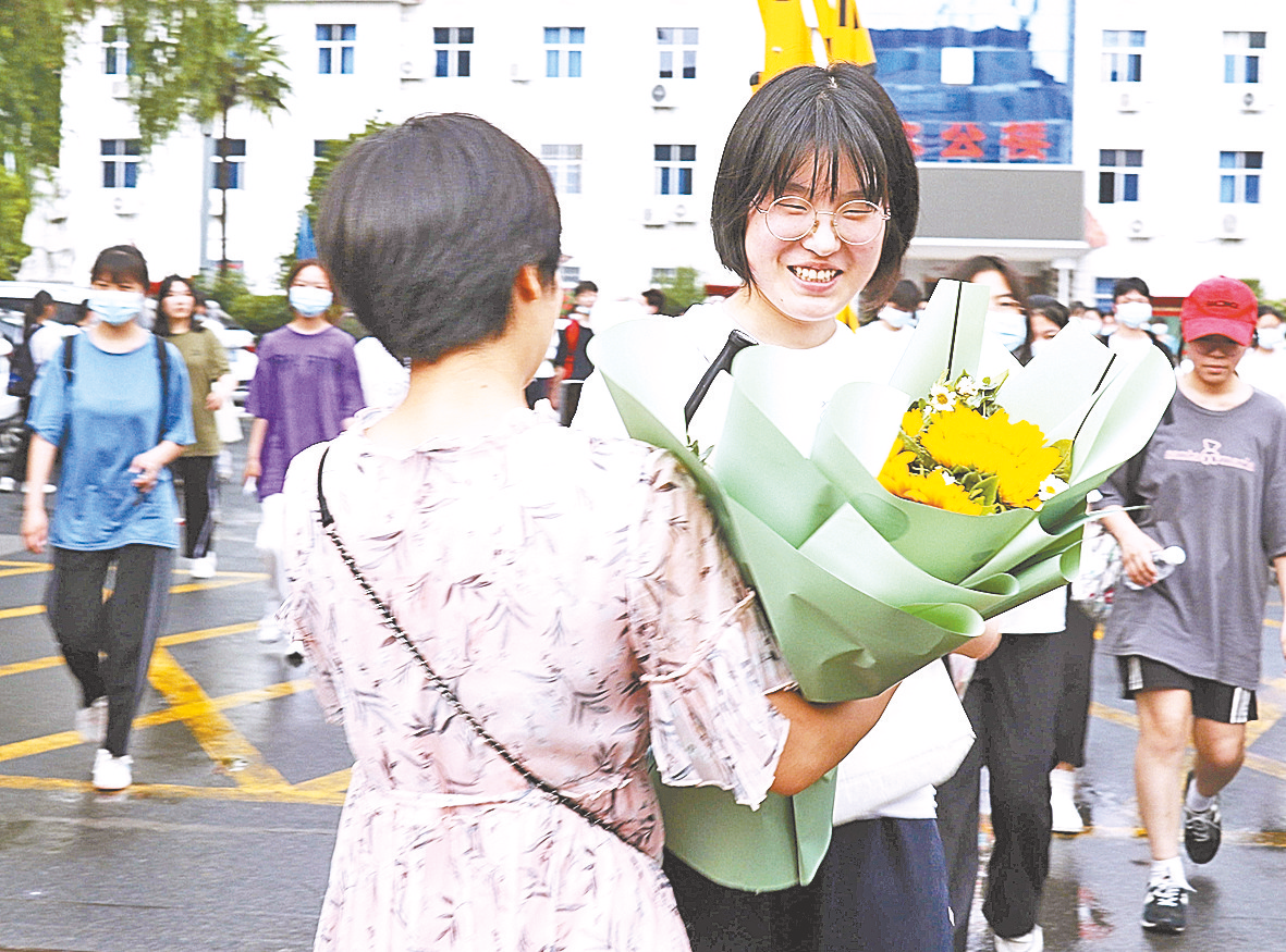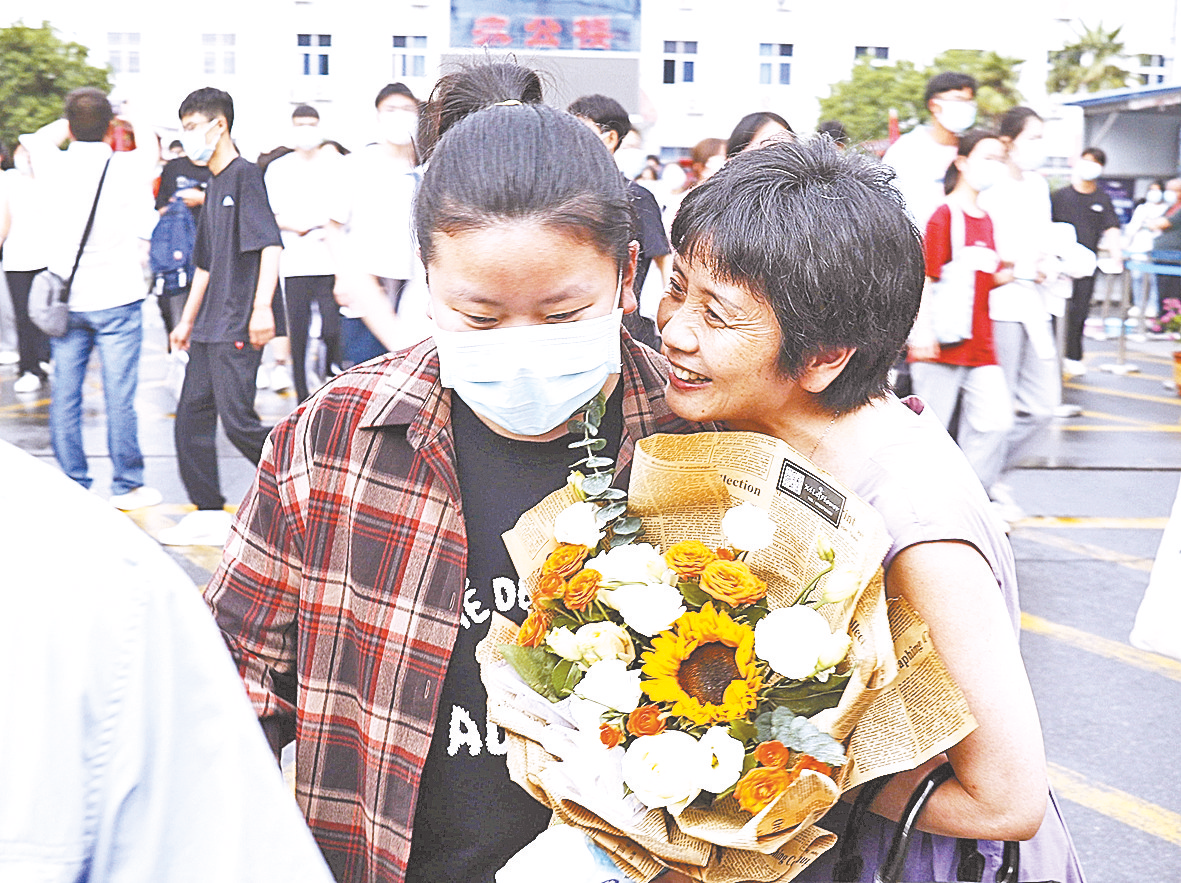 当日下午5时10分许,考生们陆续走出考场,大多数表情轻松快乐,迎接他们的是家长、老师、朋友们的鲜花、拥抱和祝福。还有部分考生和家长在考场门前合影留念。不少考生都是第一次收到父母送的鲜花,接过鲜花的一刹那,一切感动尽在不言中。