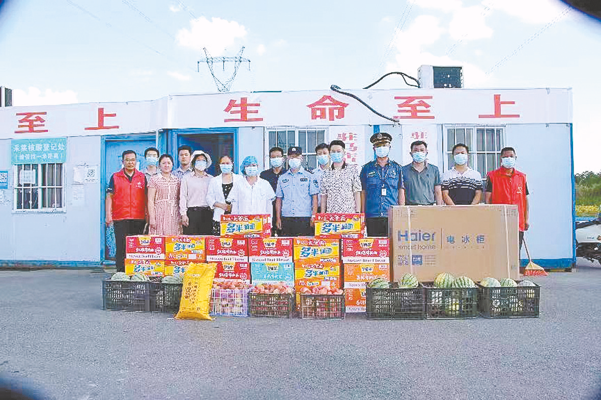 连日高温,驿城区水屯镇卫生、交通、公安、高速等多部门联合建立的驻马店南站高速疫情防控志愿者服务站的工作人员不畏酷暑,坚守岗位。6月21日,水屯镇主要负责人看望站点工作人员,镇政协委员向站点捐赠冰柜、水果、矿泉水、方便面、绿豆等防暑物资。