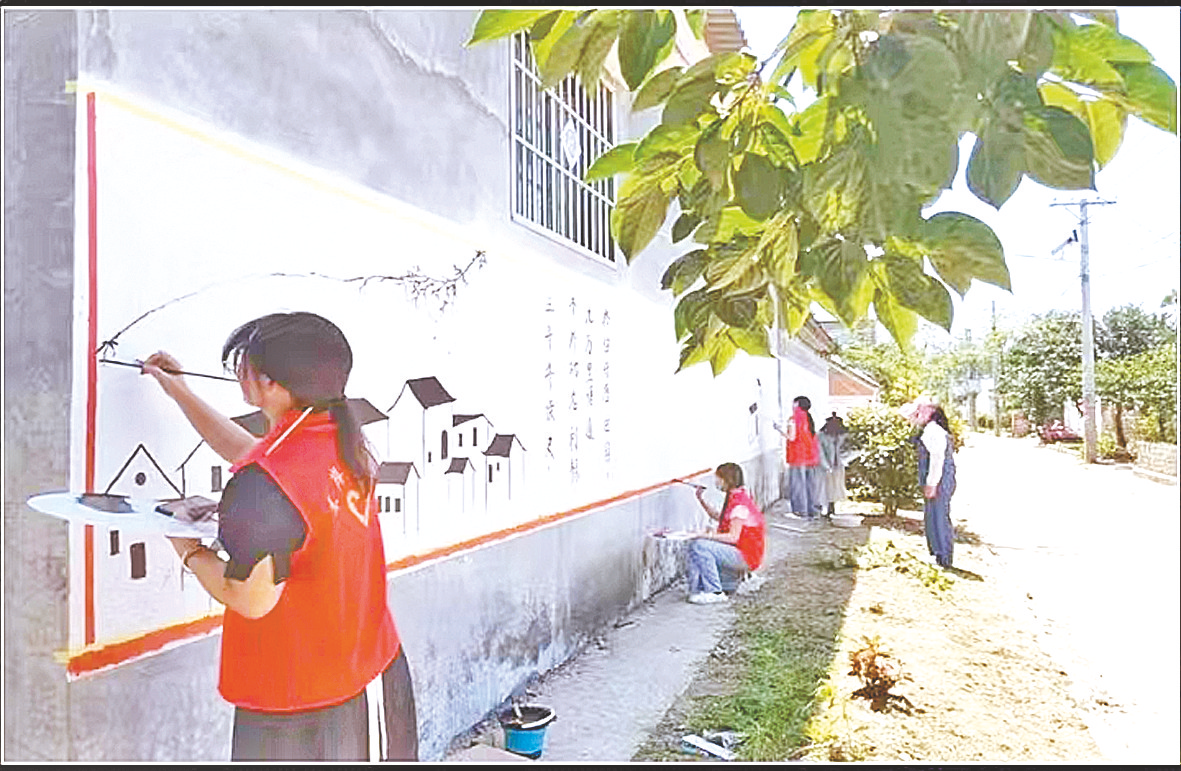 在该乡西袁村,志愿者们用手中的画笔描绘着画卷,书写着青春魅力。他们全神贯注地在墙面上打稿、勾线、上色,绘制出一幅幅生动形象的墙画(如图)。