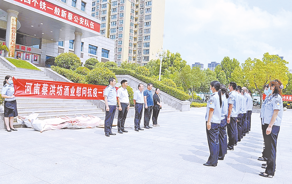 县政府副县长、公安局局长刘雪岭代表新蔡县公安局全体民警辅警对蔡洪坊酒业的爱心慰问致以衷心感谢,并表示,蔡洪坊酒业以及社会各界爱心企业的关心关爱是对新蔡公安的信任和支持,群众是人民警察身后的坚强后盾,是公安工作的重要依托和力量源泉。全县公安干警将继续发扬服从命令、听从指挥、不怕苦不怕累的斗争精神,勇挑重担、攻坚克难,以在抗疫一线的实际行动诠释人民警察的忠诚本色,让党旗和警旗在疫情防控一线高高飘扬,让警徽在疫情防控前沿熠熠生辉。