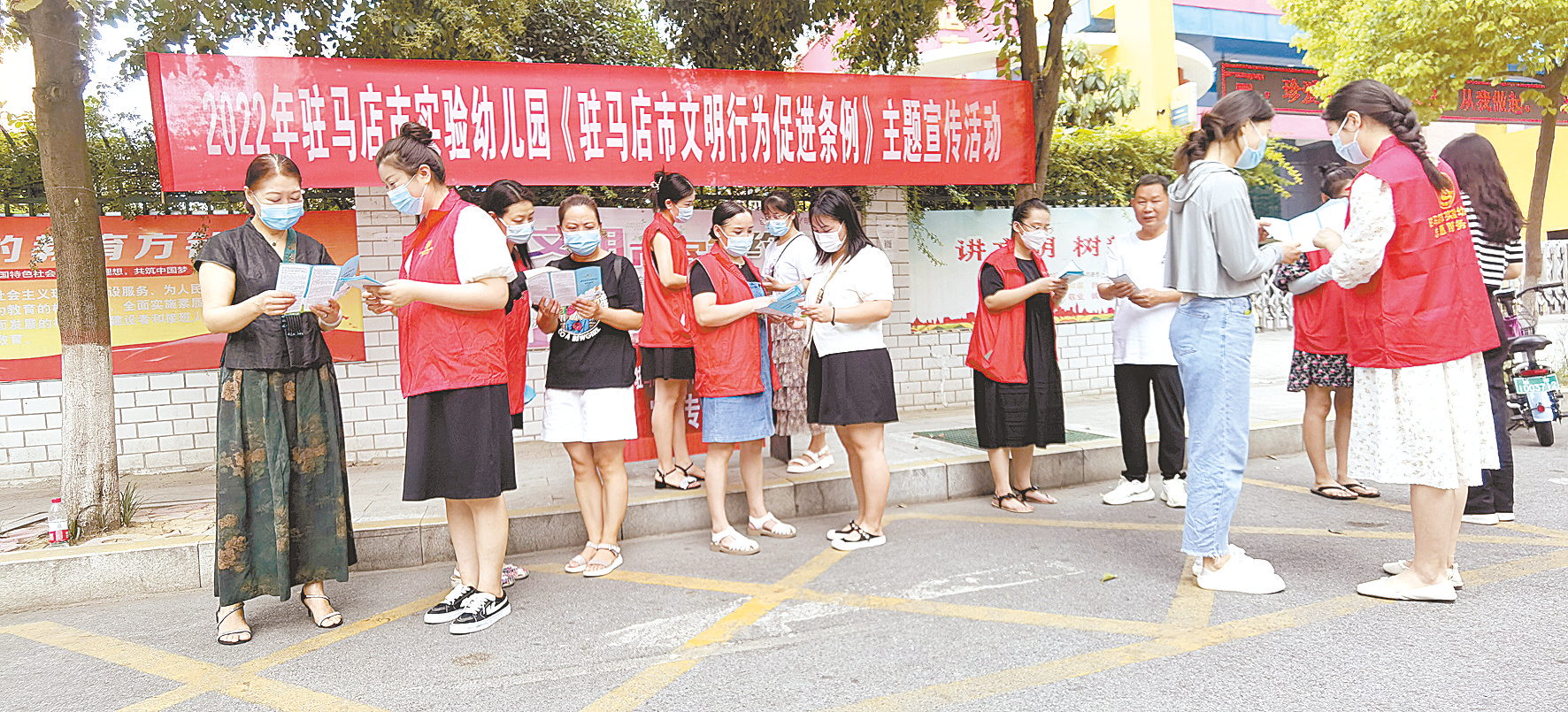 本报讯(文/图 全媒体记者 张龙 通讯员 李鹏飞)随着《驻马店市文明行为促进条例》(以下简称《条例》)的颁布实施,8月16日,驻马店市实验幼儿园开展“学习宣传践行条例、做文明有礼市民”主题宣传活动,深入宣传公共文明基本常识,规范和引导社区居民的文明行为。