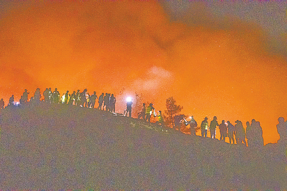 8月25日晚,在重庆市北碚区缙云山,现场救援人员坚守在火场一线灭火。 新华社记者 黄伟/摄