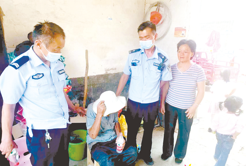 值班民警、辅警迅速到达现场,在克服老人神志不清、地势陡滑等困难情况下,将老人及时转移到安全地带。通过人像比对、走访寻找等措施,最终确定了老人的住址。随即,民警驱车将老人安全送到家(如图)。