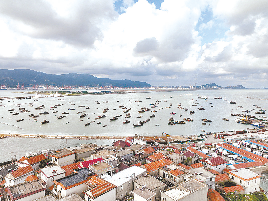 9月13日,渔船停泊在江苏省连云港市连岛中心渔港码头港湾躲避台风(无人机照片)。