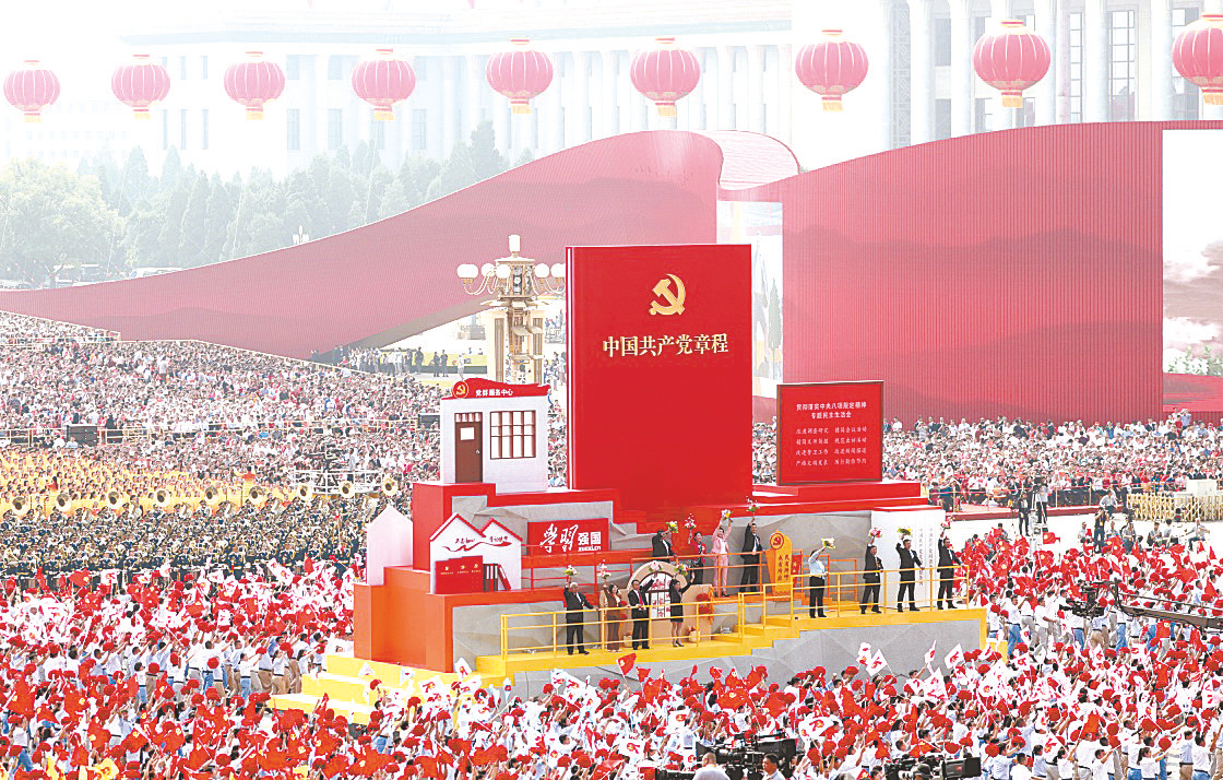2019年10月1日上午,庆祝中华人民共和国成立70周年大会在北京天安门广场隆重举行。这是群众游行中的“从严治党”方阵。新华社记者兰红光/摄
