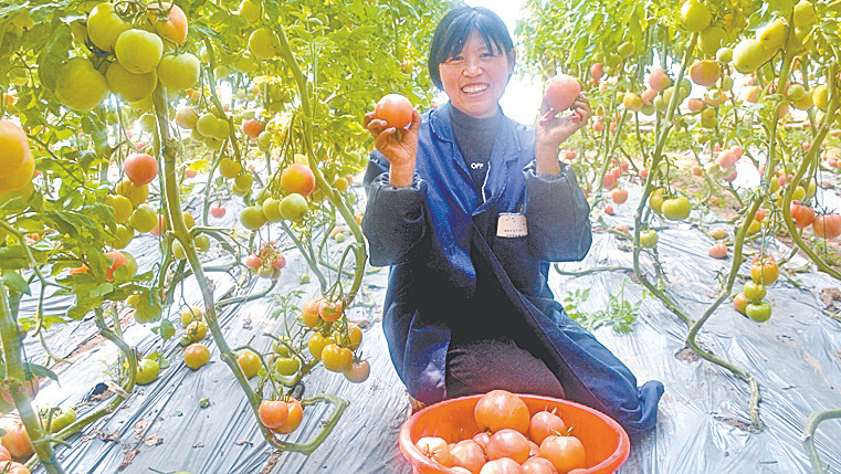 种植户王娜在采摘番茄。 文/图 全媒体记者 邓丹华
