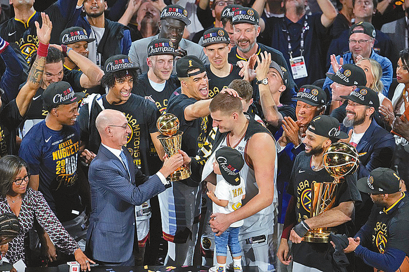 当日,在2022~2023赛季NBA总决赛第五场比赛中,丹佛掘金队主场以94比89战胜迈阿密热火队,总比分4比1夺得总冠军。掘金队球员尼古拉·约基奇当选为总决赛最有价值球员。