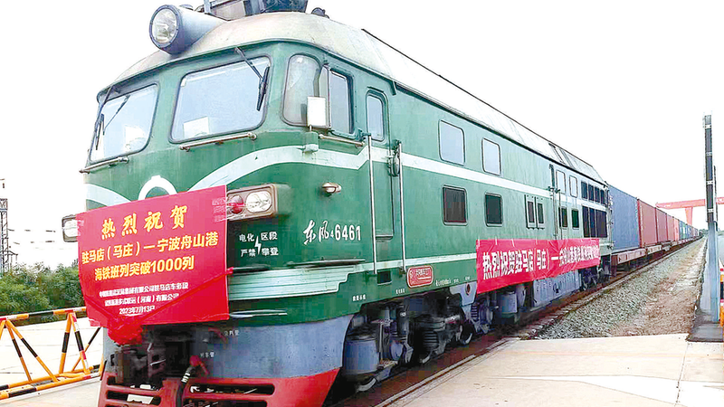 本报讯(文/图 全媒体记者 刘金霞通讯员 徐双焕)日前,随着一声长鸣,驻马店铁路物流基地从5道发往宁波港的35辆铁海联运班列缓缓启动(如图),这标志着自2017年1月11日首趟班列开行以来,驻马店车务段已连续开行1000列,共37274辆,发送99.5万余吨货物。