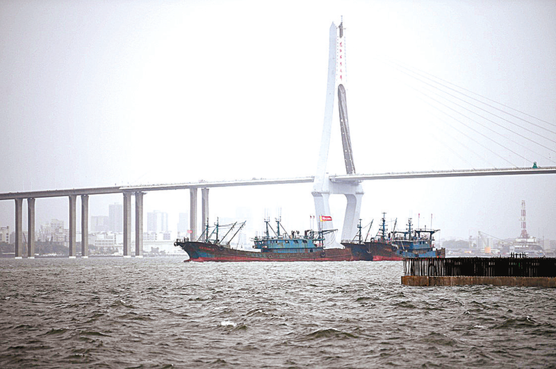 7月17日,在广东湛江金沙湾水域,船只开往内海湾锚泊防台。