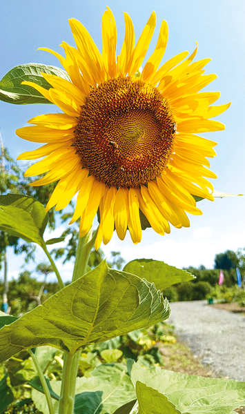 走进九合庄园,成千上万株向日葵映入眼帘。笔直翠绿的枝干,金黄艳丽的花瓣像一张张金灿灿的笑脸,在阳光的照耀下显得格外明艳动人。