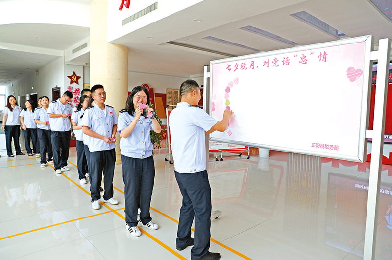 大家把对党的深情告白写在爱心 小卡片上 本报讯(文/图 通讯员 黄丹阳 张俸粒)为充分发挥党建统领作用,培育和践行社会主义核心价值观,厚植干部职工爱党爱国情怀,近日,正阳县税务局开展对党话“忠”情活动。