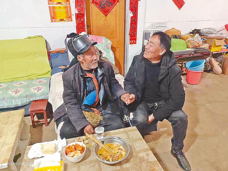 1月5日晚,驿城区蚁蜂镇赵台村村干部樊保才在赵台村发现一名老人在路边冻得瑟瑟发抖,便上前询问,老人支支吾吾说不清楚。樊保才让家人给老人做饭、向蚁蜂镇政府和赵台村委反映情况的同时并向公安派出所求助。在等待寻找老人信息的过程中,樊保才与民警陪在老人身边,让老人吃上热乎的饭菜,安抚老人焦虑的情绪(如图)。赵台村党支部书记齐振平得知情况后也赶了过来,积极为老人找家。