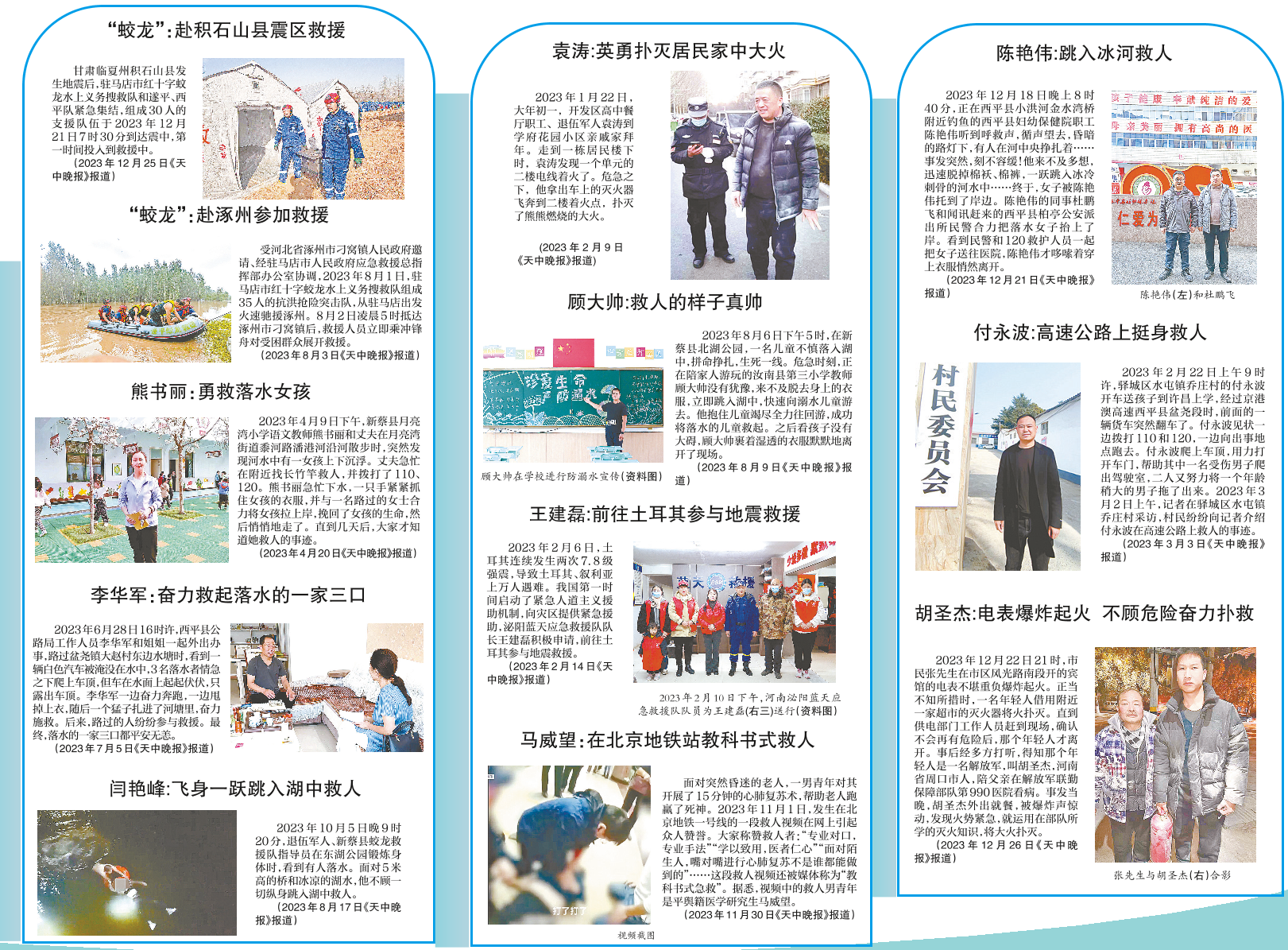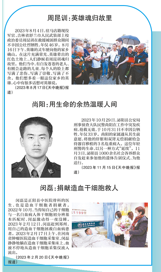 凡人微光,汇聚成炬,也能灿若星辰。翻开2023年本报的报道,在我们身边,有很多英雄,他们在别人危难时刻仗义出手,奋不顾身,彰显了人性之美,诠释了正义之魂;更有甚者选择用生命守护生命,以凡人微光激扬浩然正气、传递人间大爱,给予我们前行的力量。今天,让我们再次走近身边的这些英雄,重温他们的事迹,再次向他们致敬。