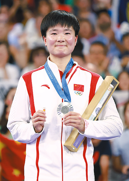 亚军中国选手何冰娇在巴黎奥运会羽毛球女子单打颁奖仪式上一手握着银牌,一手握着西班牙奥委会徽章(2024年8月5日摄)。新华社记者任正来/摄