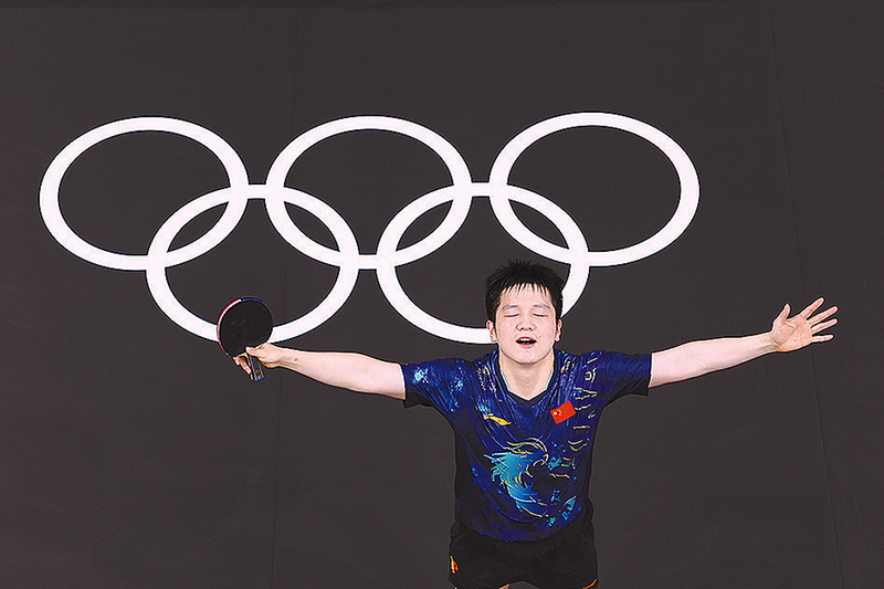 中国选手樊振东在巴黎奥运会乒乓球男单四分之一决赛中战胜日本选手张本智和,晋级四强(2024年8月1日摄)。 新华社记者 徐子鉴/摄