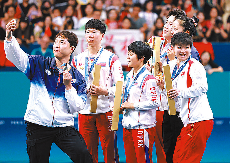 冠军中国组合王楚钦(右三)/孙颖莎(右一)、亚军朝鲜组合李正植(左二)/金琴英(左三)和季军韩国组合林钟勋(左一)/申裕斌在巴黎奥运会乒乓球混合双打颁奖仪式上自拍合影(2024年7月30日摄)。 新华社记者 刘续/摄