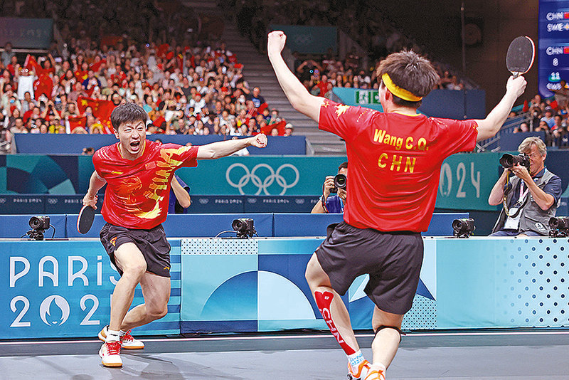 中国队组合马龙(左)/王楚钦在巴黎奥运会乒乓球男子团体金牌赛中战胜对手后庆祝(2024年8月9日摄)。 新华社记者 刘续/摄