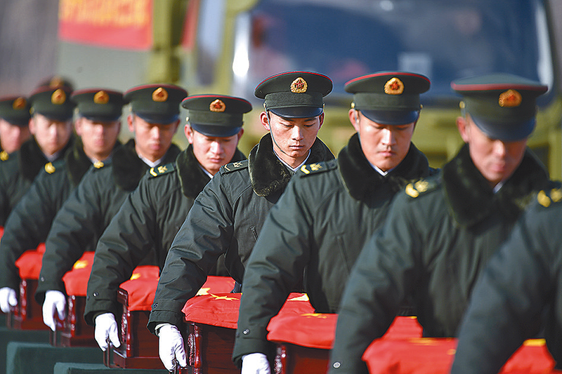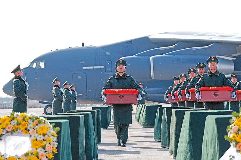 11月28日,在沈阳桃仙国际机场,礼兵将殓放志愿军烈士遗骸的棺椁从专机上护送至棺椁摆放区。当日,第十一批在韩中国人民志愿军烈士遗骸回国。 新华社记者 李杰/摄