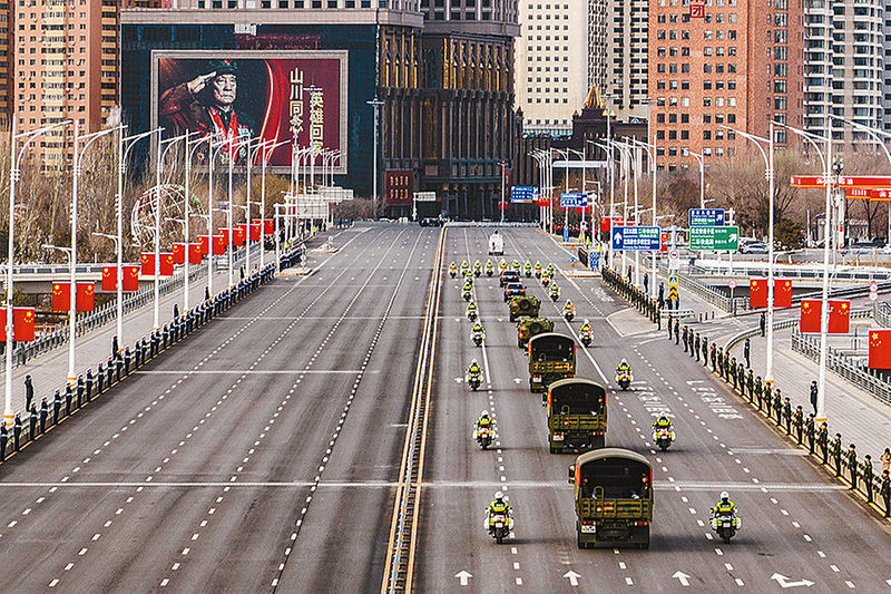 11月28日,运送志愿军烈士遗骸的车队经过沈阳青年大街(无人机照片)。当日,第十一批在韩中国人民志愿军烈士遗骸回国。 新华社发(许志康/摄)