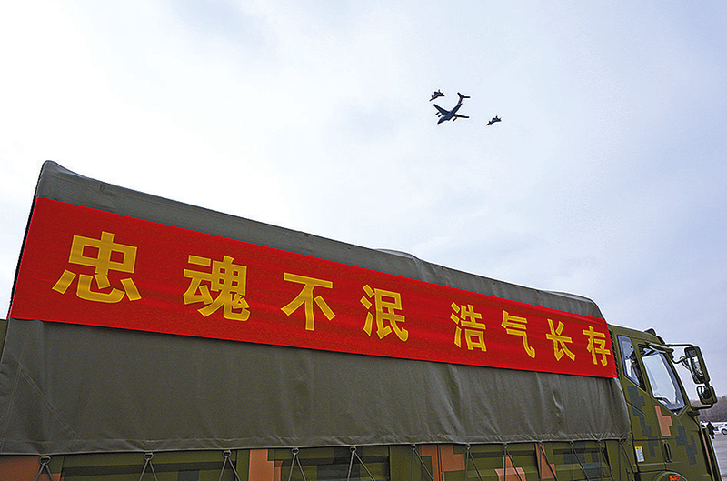 12时07分,一架空军运-20专机缓缓降落在沈阳桃仙国际机场。空军两架歼-20战斗机在专机进入中国领空后为专机伴飞护航,并在沈阳桃仙国际机场上空通场飞行,向志愿军烈士致以崇高敬意。专机降落后,沈阳桃仙国际机场以“过水门”最高礼仪迎接志愿军烈士回家。