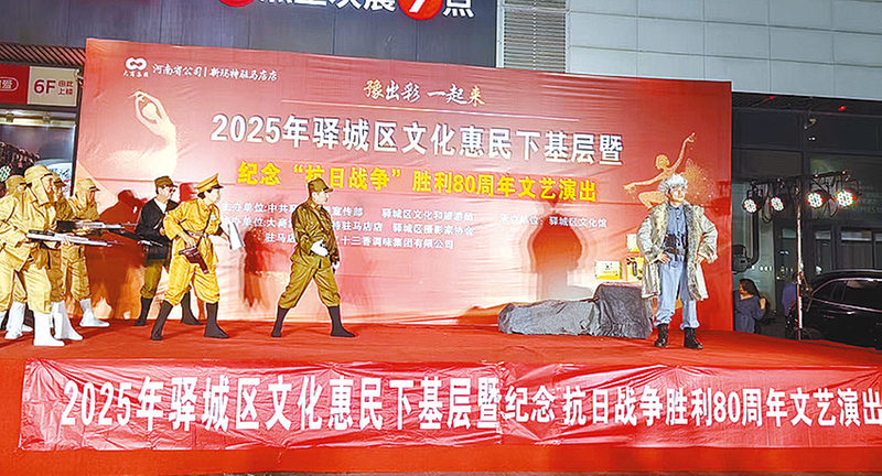 本报讯(文/图 全媒体记者 李贺建)8月31日下午,由驿城区委宣传部、驿城区文化和旅游局主办,驿城区文化馆承办,驿城区摄影家协会、驻马店市十三香调味品集团有限公司协办的“豫出彩一起来”2025年驿城区文化惠民下基层活动之纪念中国人民抗日战争暨世界反法西斯战争胜利80周年文艺演出,在大商新玛特商场门前广场精彩上演(如图)。