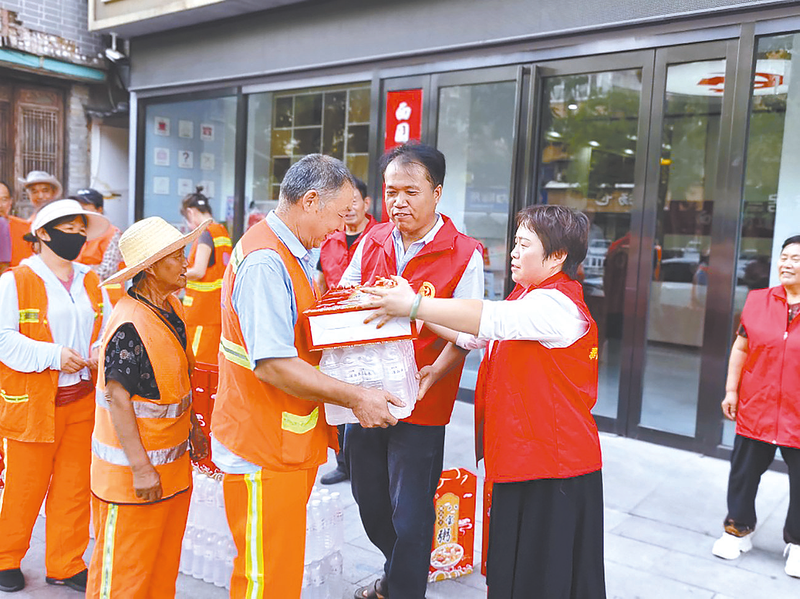 郭保刚(右二)给环卫工人送温暖 文/图 全媒体记者刘金霞