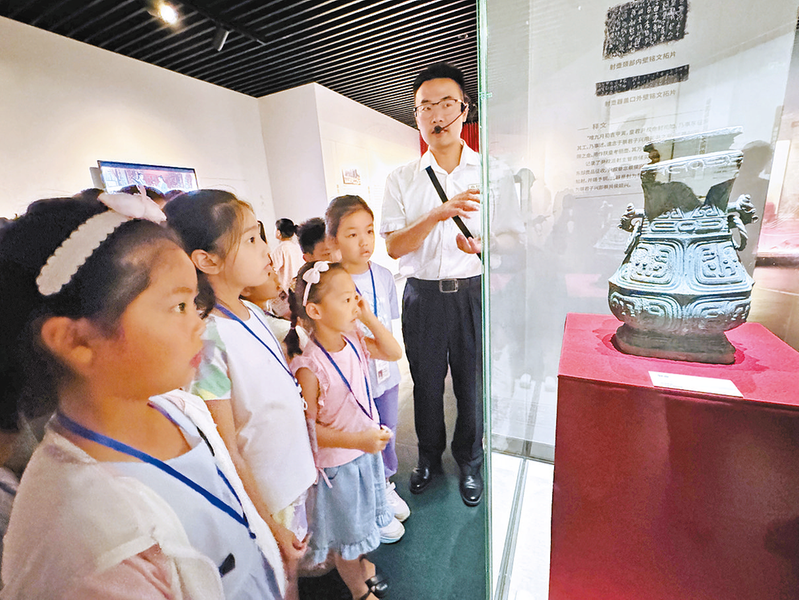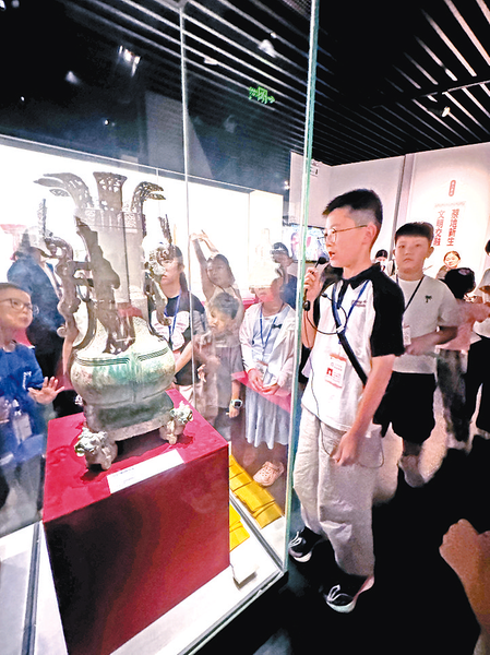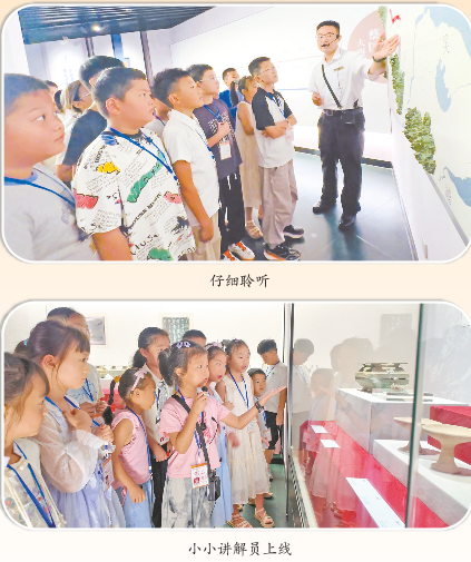 参观过程中,一件造型独特的蔡国时期的酒器引起了大家的格外关注。小记者们围在展柜前,仔细观察着它的形状、纹路,讲解员详细介绍了这件酒器的用途、制作工艺以及背后的文化内涵,让小记者们对蔡国的礼仪文化有了更直观的认识。参观完,有几名小记者还当起小小讲解员,为大家分享对文物的了解。